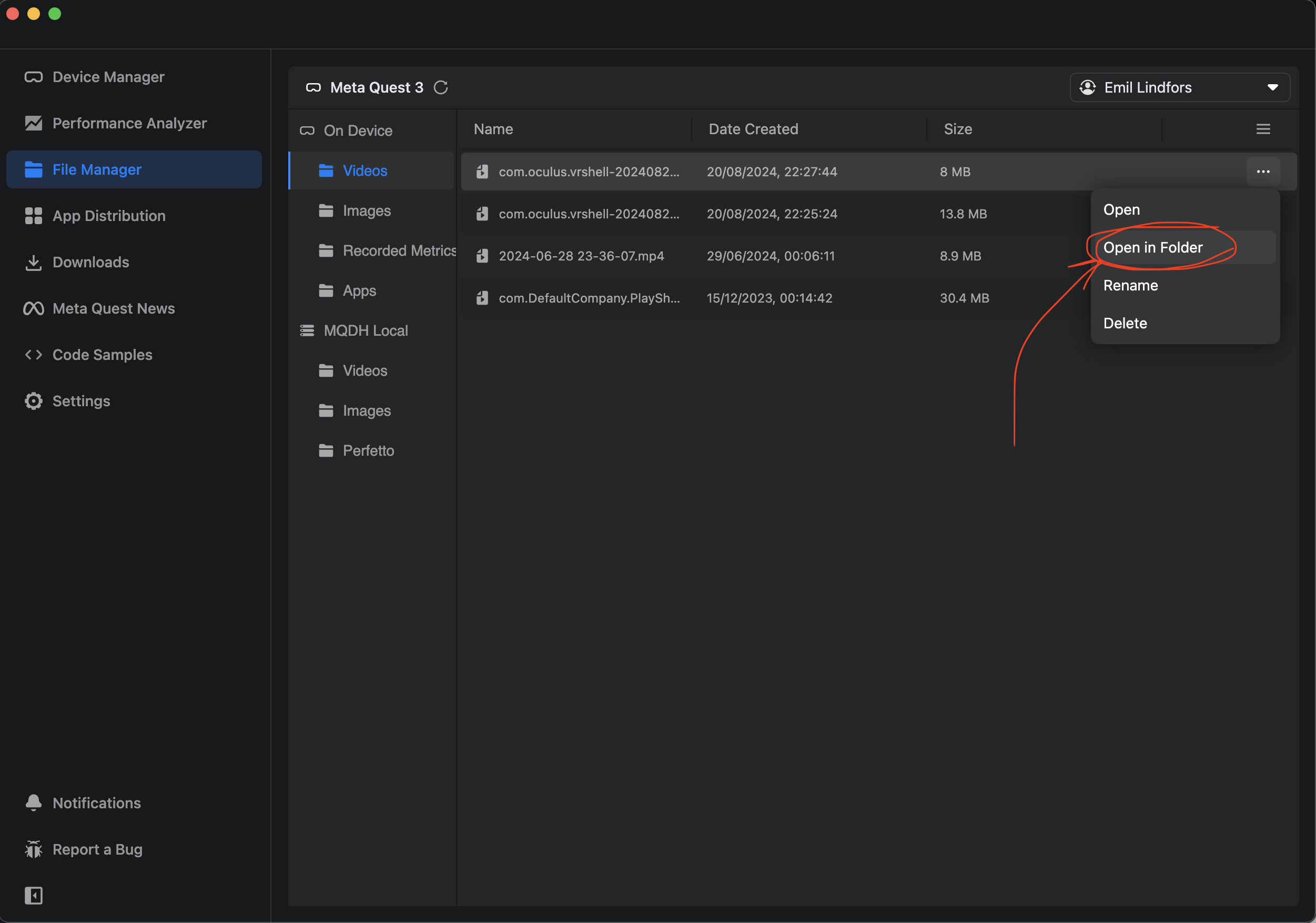 Using the Meta Quest Developer Hub (MQDH) to transfer videos from the Quest headset to a computer.